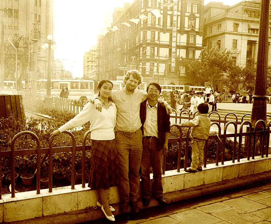 Outside the old Radio Shanghai building in June 1989. Lu Ming, Brian and Zhou Rui Kang.